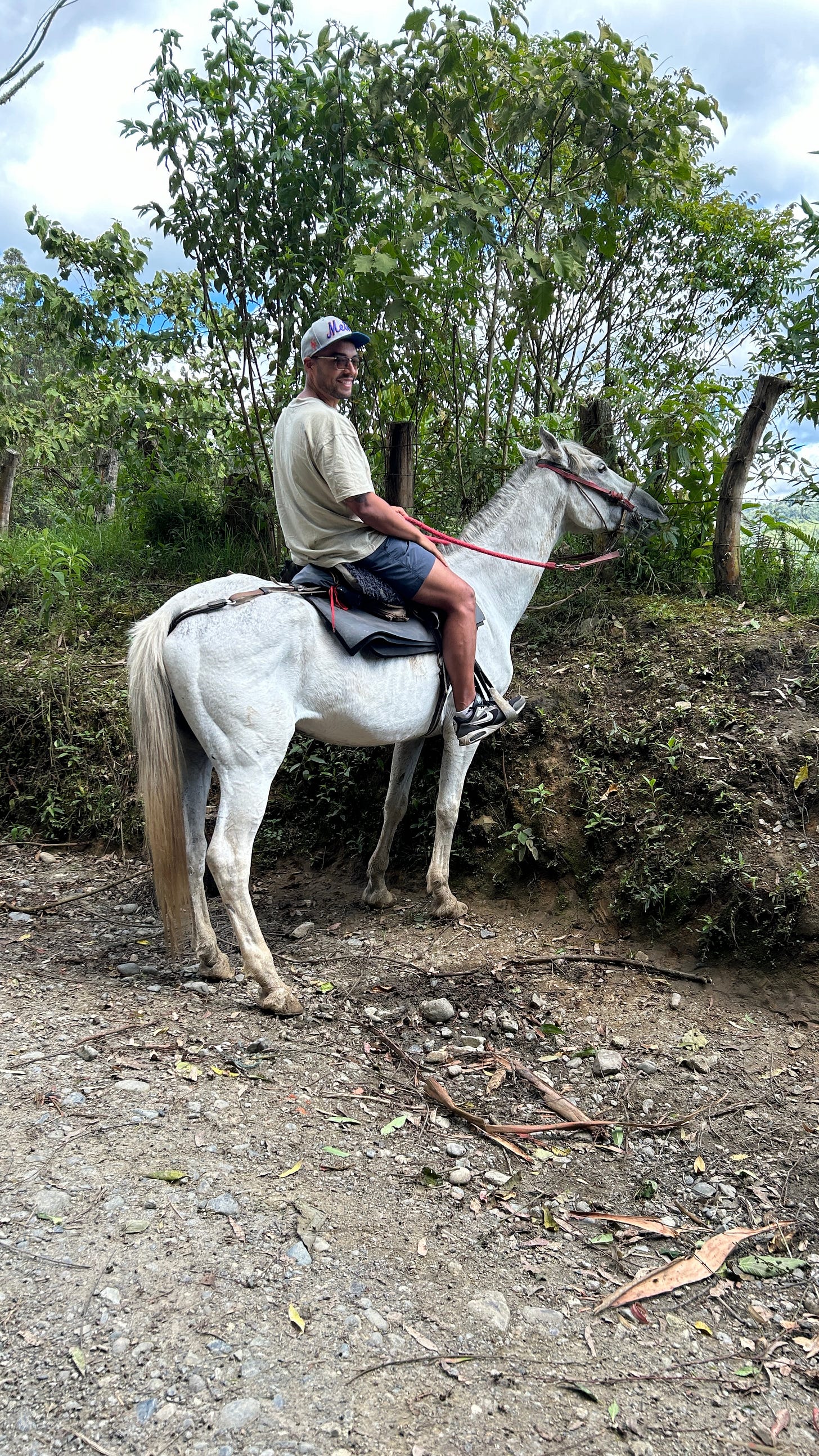 She led us down a dirt road where a man stood with horses tied to a fence. After a quick WhatsApp exchange–our only “paperwork” for the afternoon–we saddled up. My son rode with his grandma, leaving me on a beautiful white horse with an ego that insisted on leading the pack.