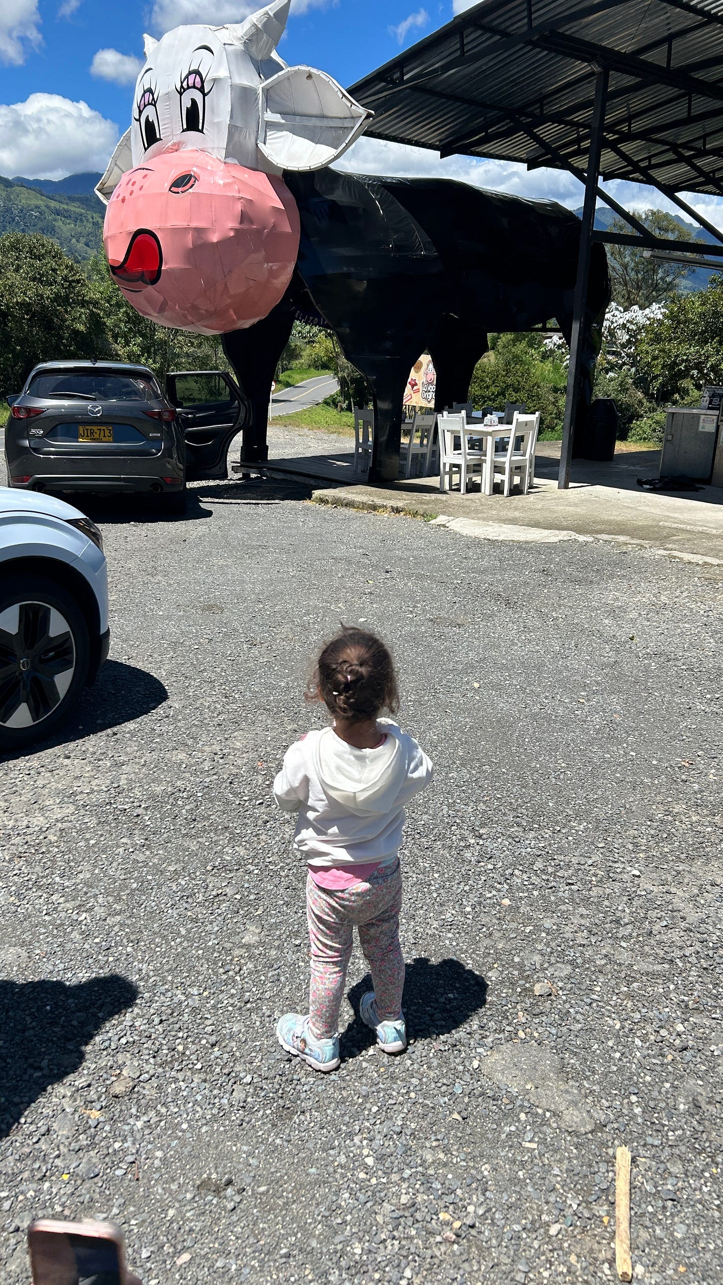 On the ride over, we pulled over to La Vaca Original, a dessert stand halfway to Salento that–true to name–has a huge cow installation overlooking the mountainside and sells arroz con leches and baked delicacies like pan de bonos and bunelos. I have seen it before, but my daughter–a big fan of cows, and now old enough on this trip to truly notice the world around her–stared at it for a while in amazement. Just seeing the light in her eyes made it worthwhile.