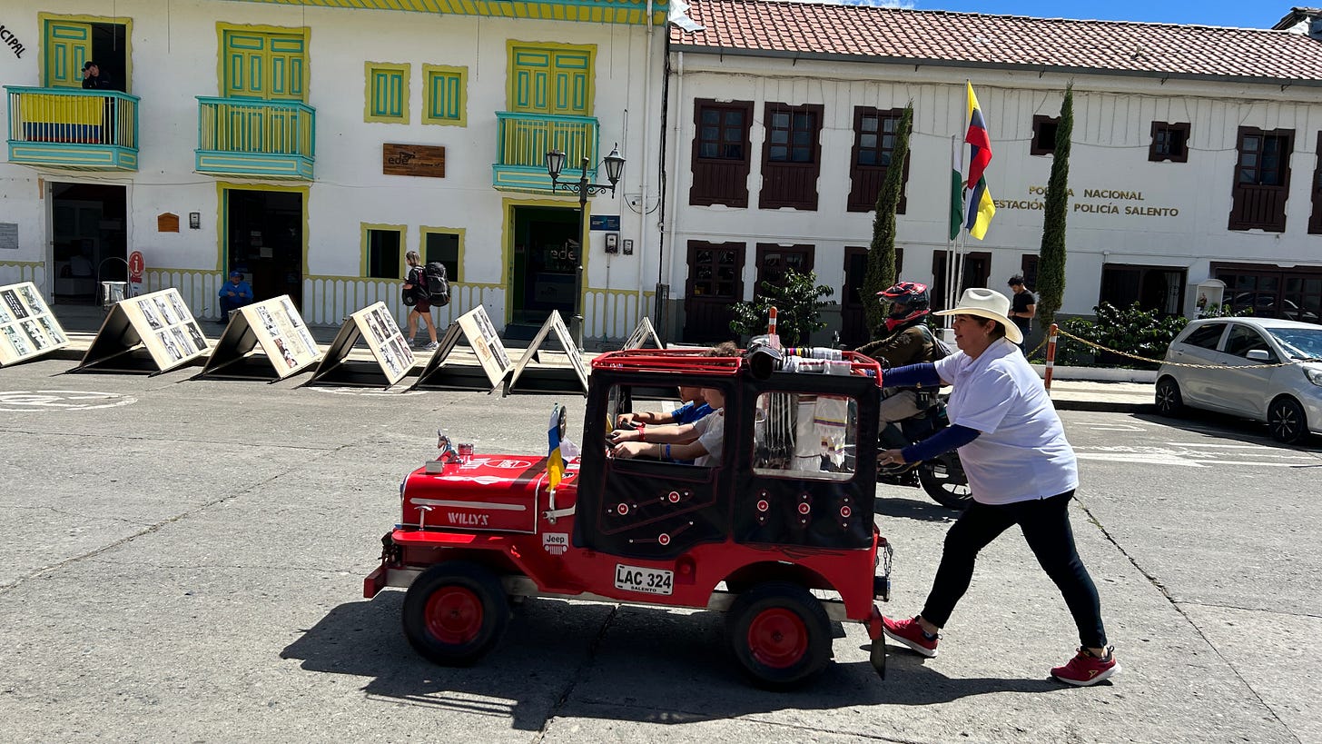 Our kids and their kids combined forces and tore up the house again, which was enough of an incentive to get us to all roll out to Salento, a small town an hour outside of Armenia. There were only two cars, so all the kids lapped up on parents, which is normal in a country where seatbelts and stop signs are optional, and where people will stack up in everything from a moped to a horse to get where they need to go.