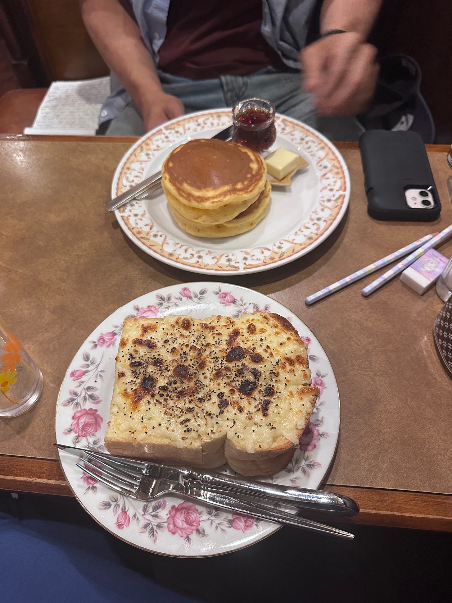 The next morning I wanted us to rise together and have a day, like how people do. I mapped to a restaurant that was Victorian English woman themed: dark wood paneling, old fashioned clocks, waitresses wearing bonnets. The only food on the menu was toast and pancakes that were remarkably fluffy and dry. They tasted like sponges with butter on top. The coffee was good though, served in teacups.